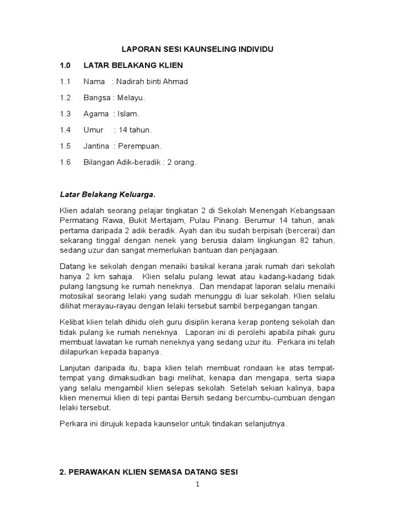 Pdf analisis keperluan kaunseling terhadap masalah penceraian kajian kes kualitatif di jabatan agama islam johor. Format laporan sesi kaunseling individu nota kes dan nota kemajuan berbentuk struktur — format dart d = penerangan tentang klien dan situasi (description of . Laporan sesi kaunseling individu unit kaunseling open university kuala lumpur kaunselor : Llaporan sesi kaunseling sesi pertama. Sskc 2323 kemahiran kaunseling individu slide pembentangan laporan sesi. Laporan sesi kaunseling individu no. Aras 1, blok e9, kompleks e, .